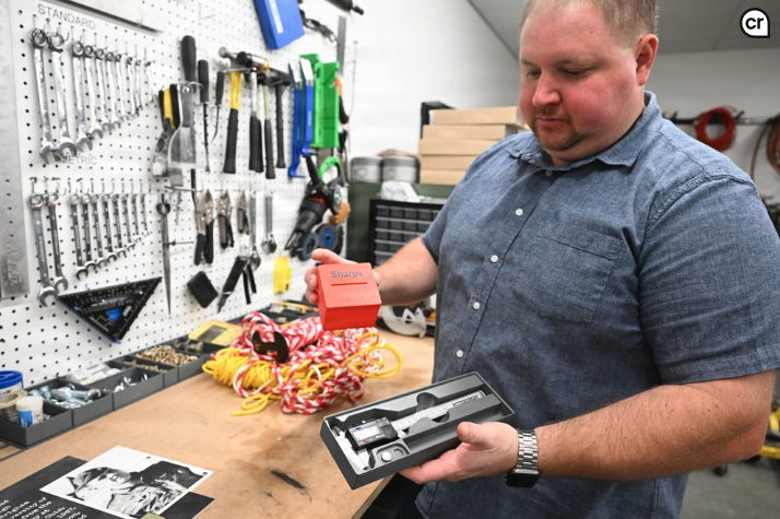 John Sluder, Hill Aerospace Museum exhibit specialist, shows organization containers printed with 3D technology Sept. 12, 2025, at Hill Air Force Base, Utah.