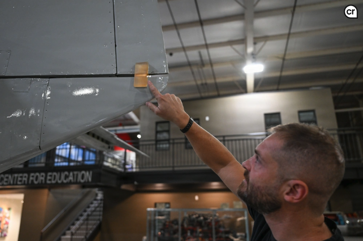 Brandon Hedges, Hill Aerospace Museum’s restoration chief, shows a 3D printed part on an A-1 Skyrider flap Sept. 12, 2025, at Hill Air Force Base, Utah. The technology has delivered an 80% cost savings and saved hundreds of hours since the museum acquired the printers and scanners for restoration and exhibits.
